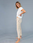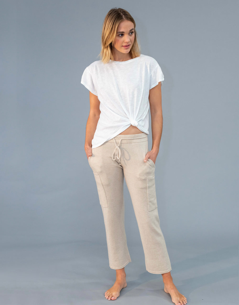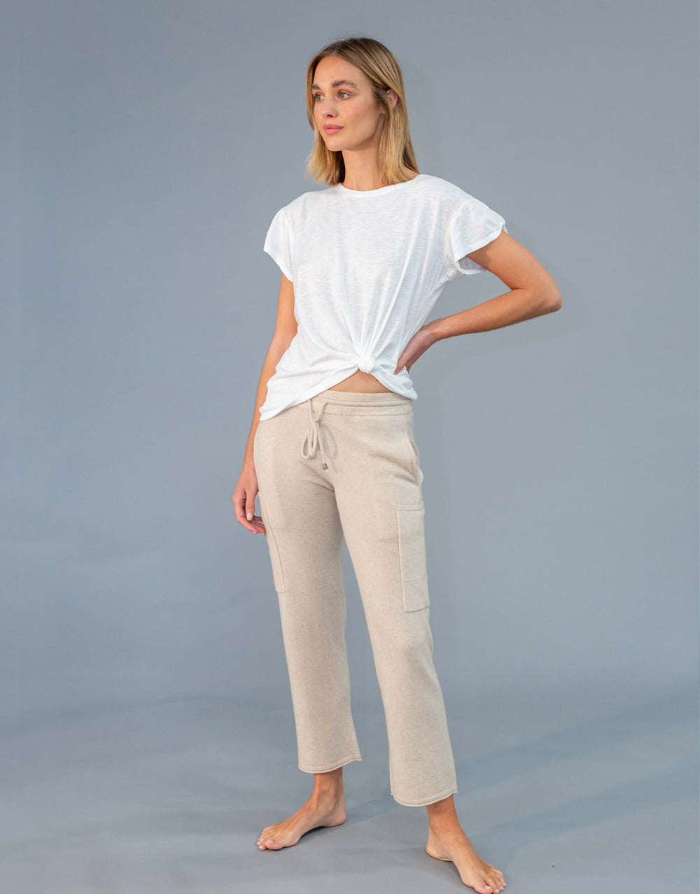Straight leg cut, side pockets and cargo pockets on the side of the leg, an elastic waistband with a cashmere draw string with small coil shaped metal cord ends details. Relax in style in these comfortable, soft cashmere cargo pants.