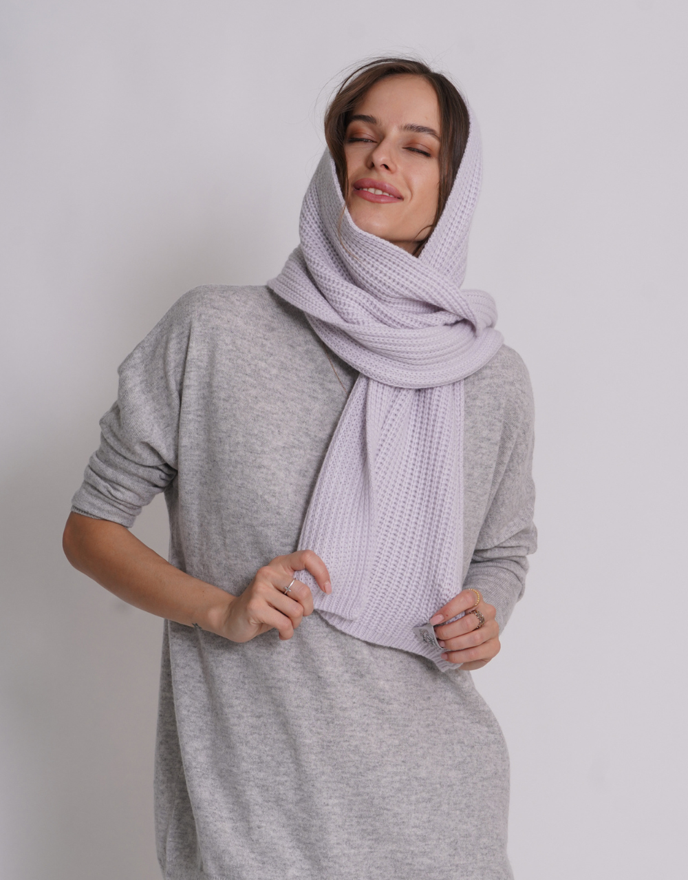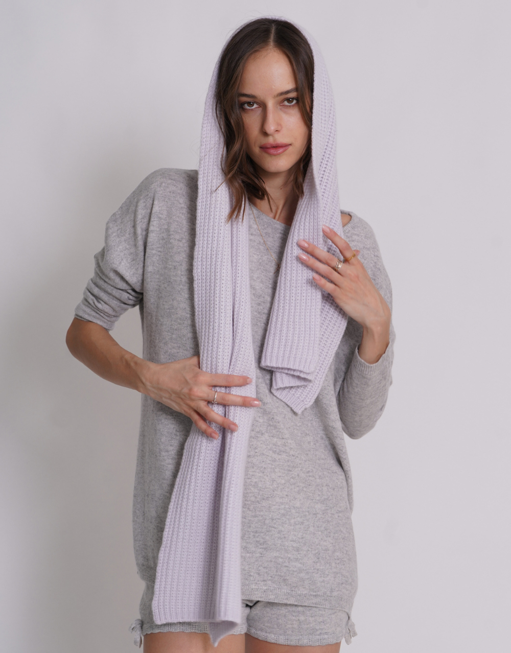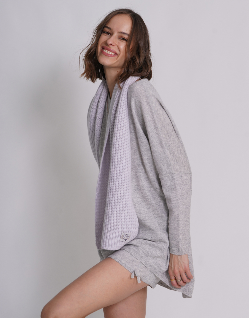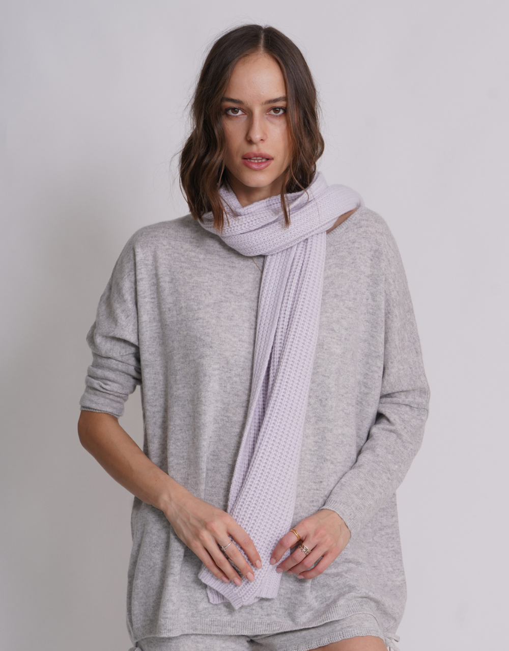 Keep warm and cozy in this gorgeous cashmere scarf. Layer your winter wardrobe with this timeless knit scarf, get the Bomber Beanie for the matching set.