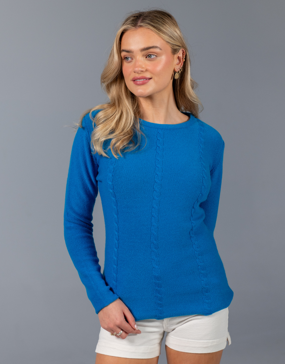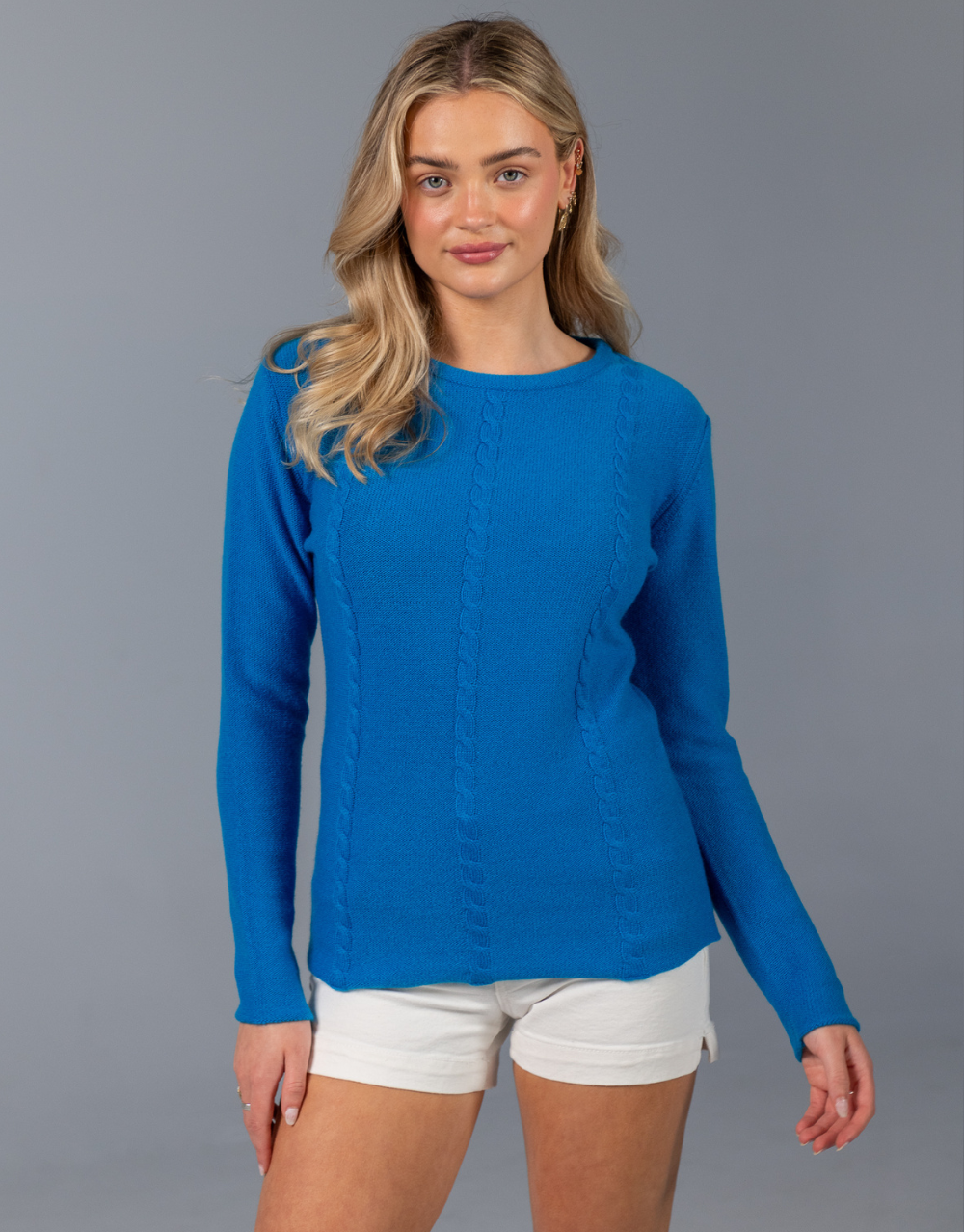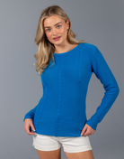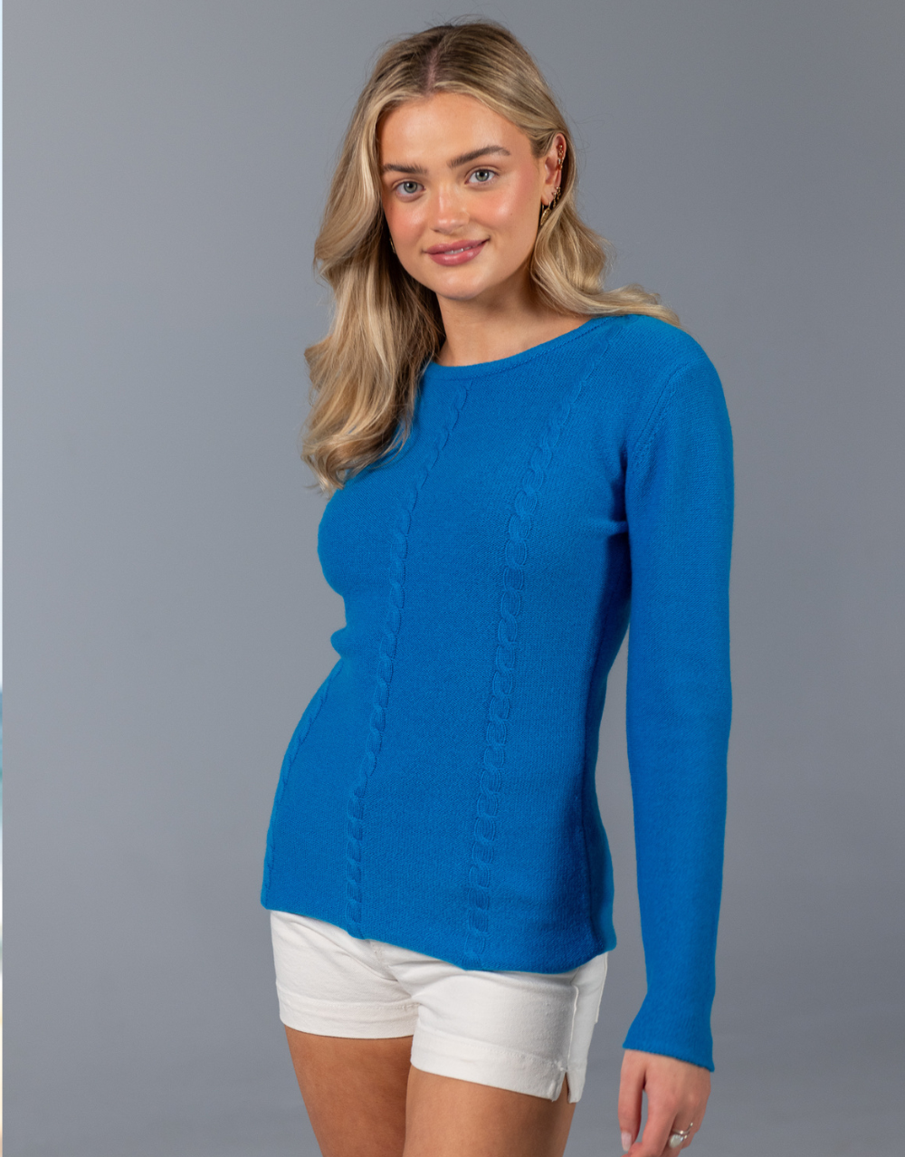 This playful long-sleeved cashmere sweater with cable details is fun for all seasons. Lightweight enough for Spring and Summer, while also making the perfect layering piece for fall and winter.