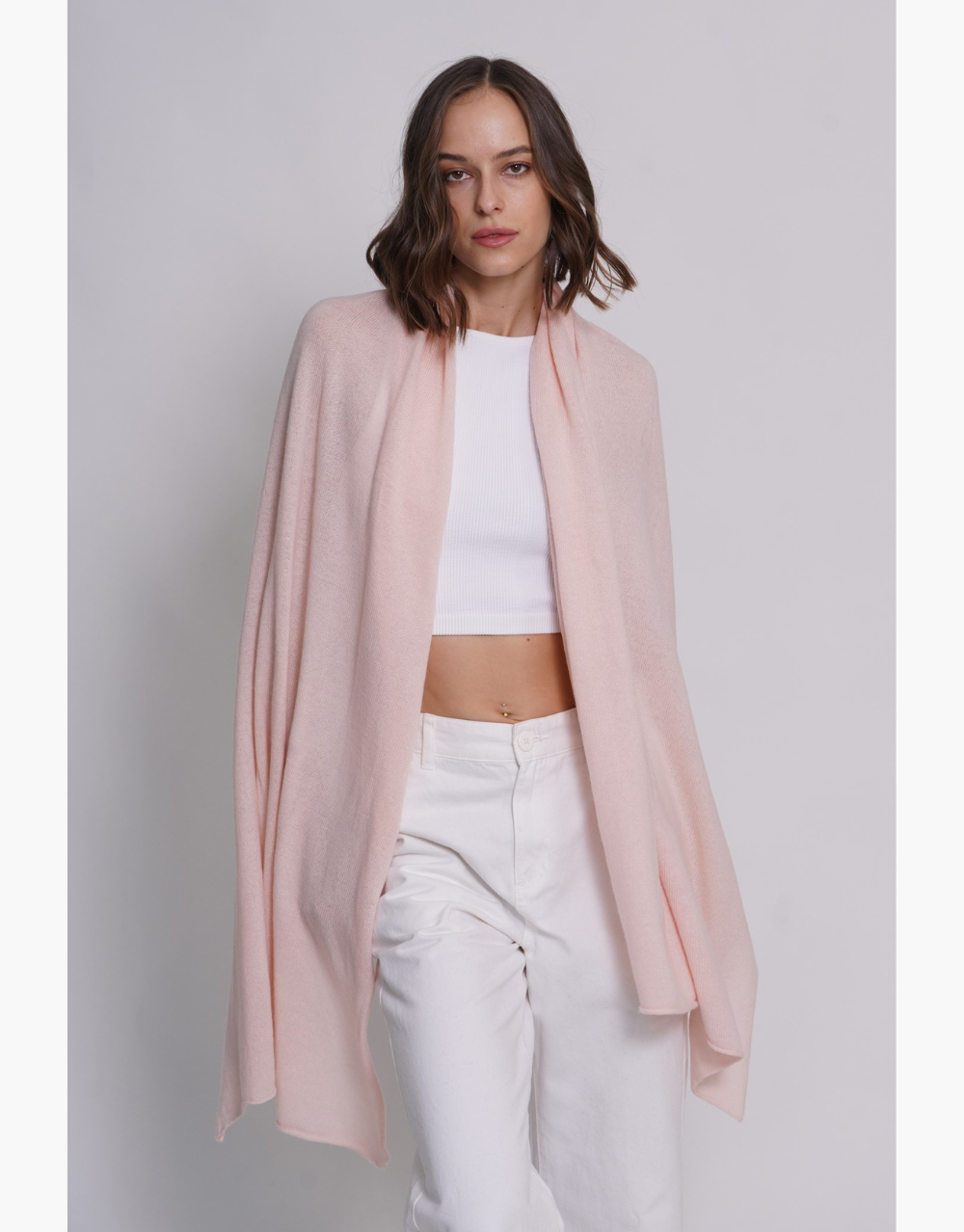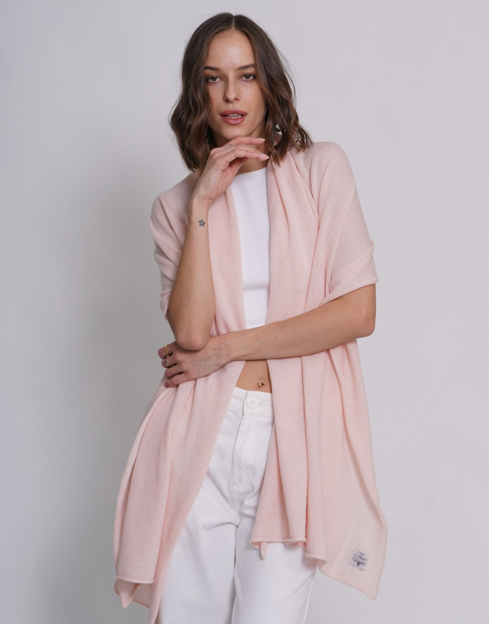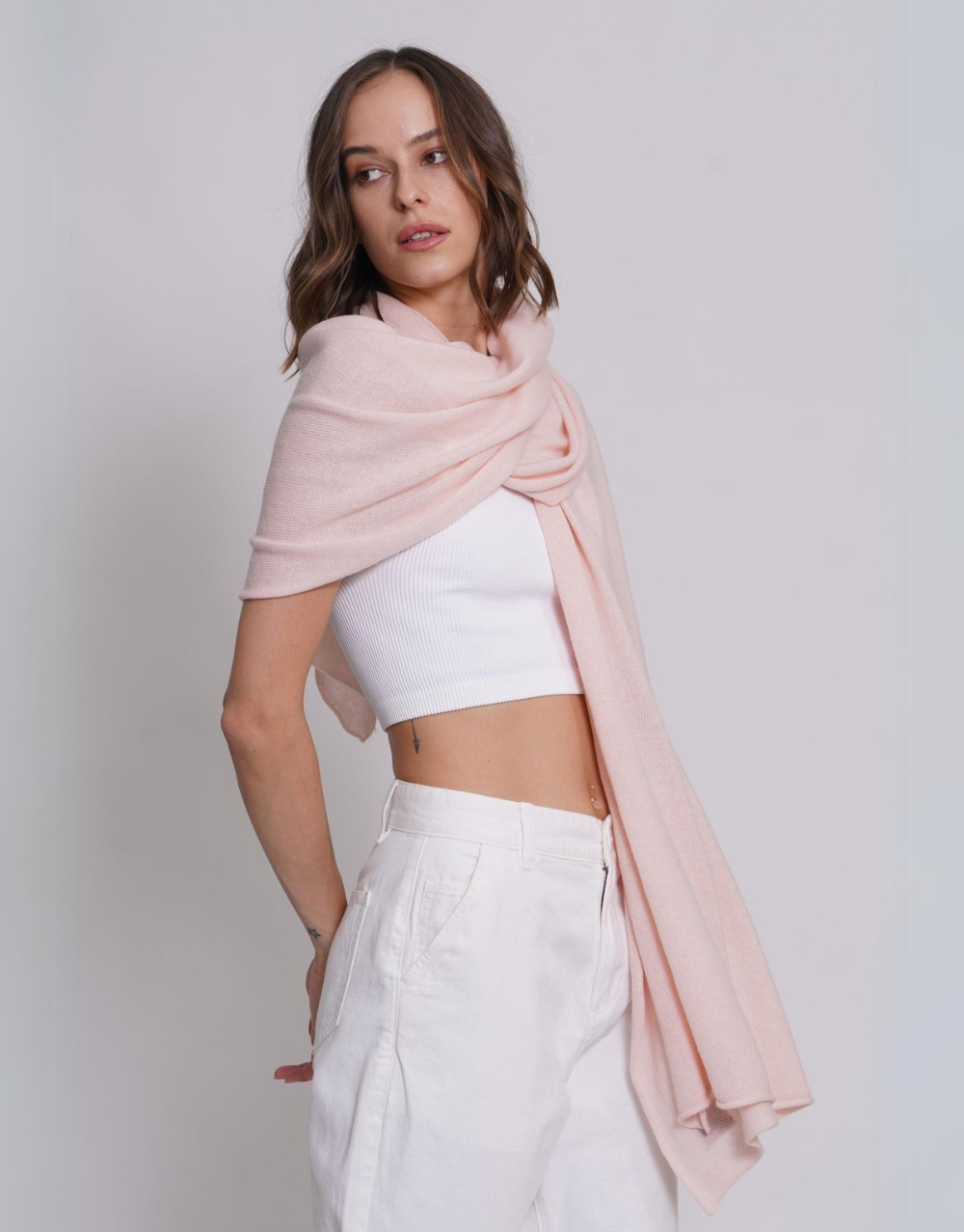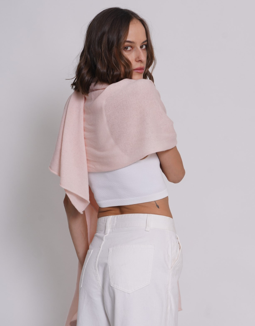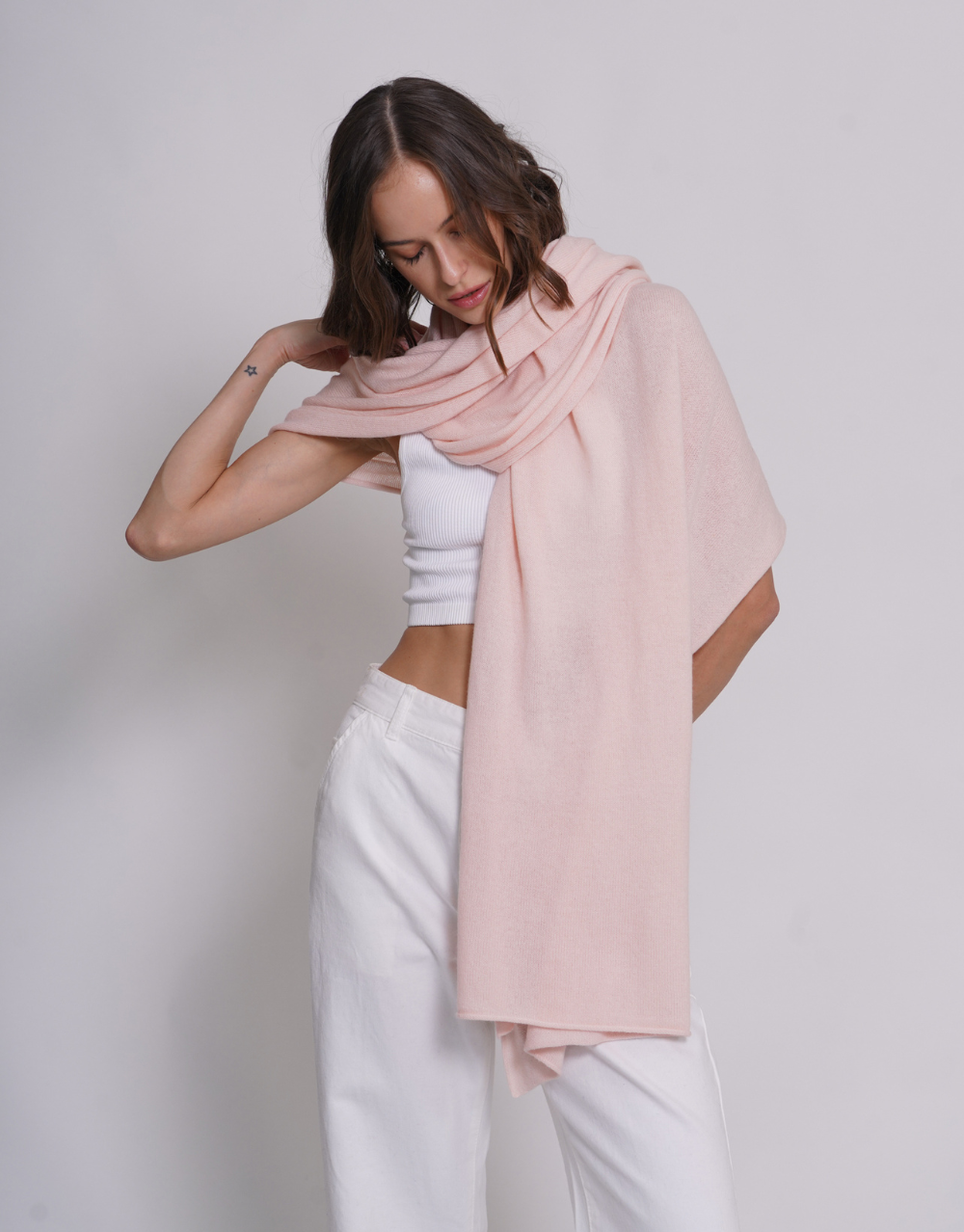 Soft scarf with raw edges, 2-ply, loose flat knit. 100% cashmere.