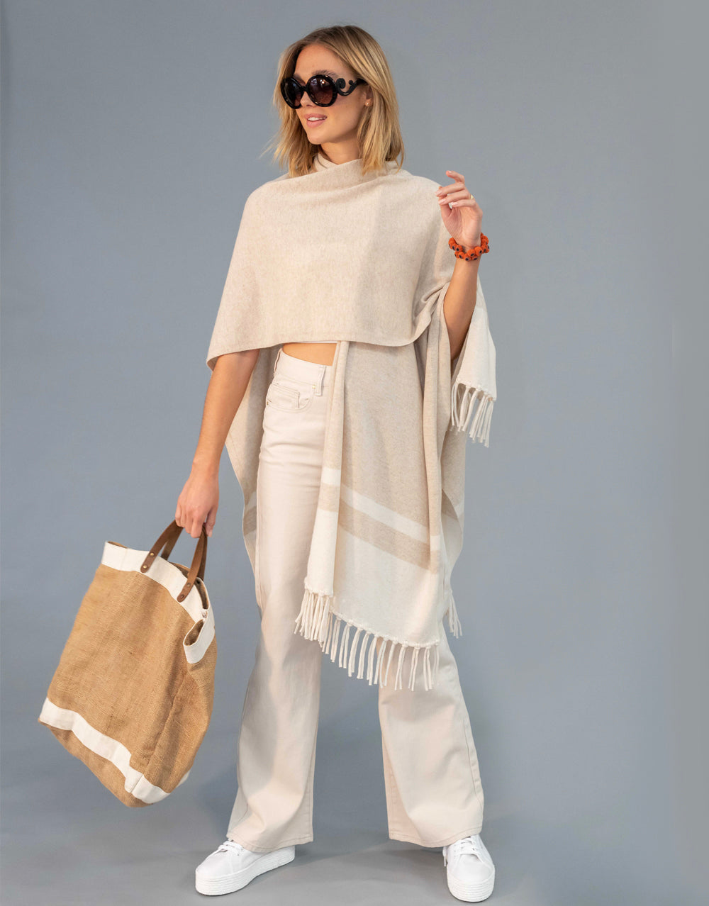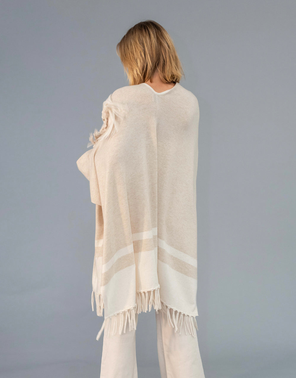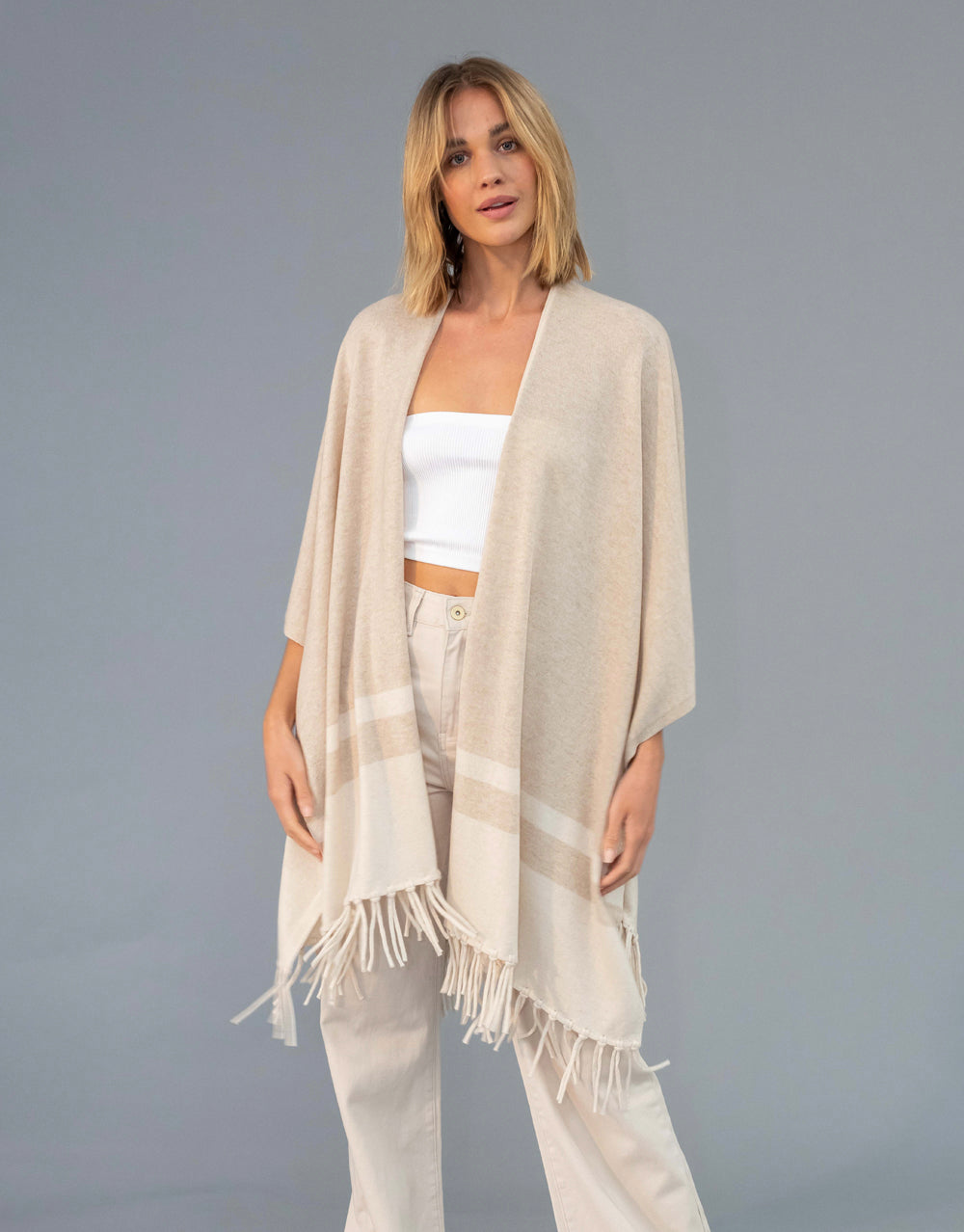 Un-Dyed Contrast Tassel Cape in Sand