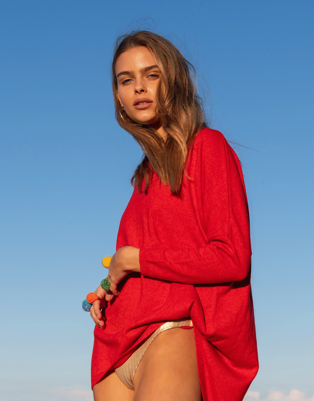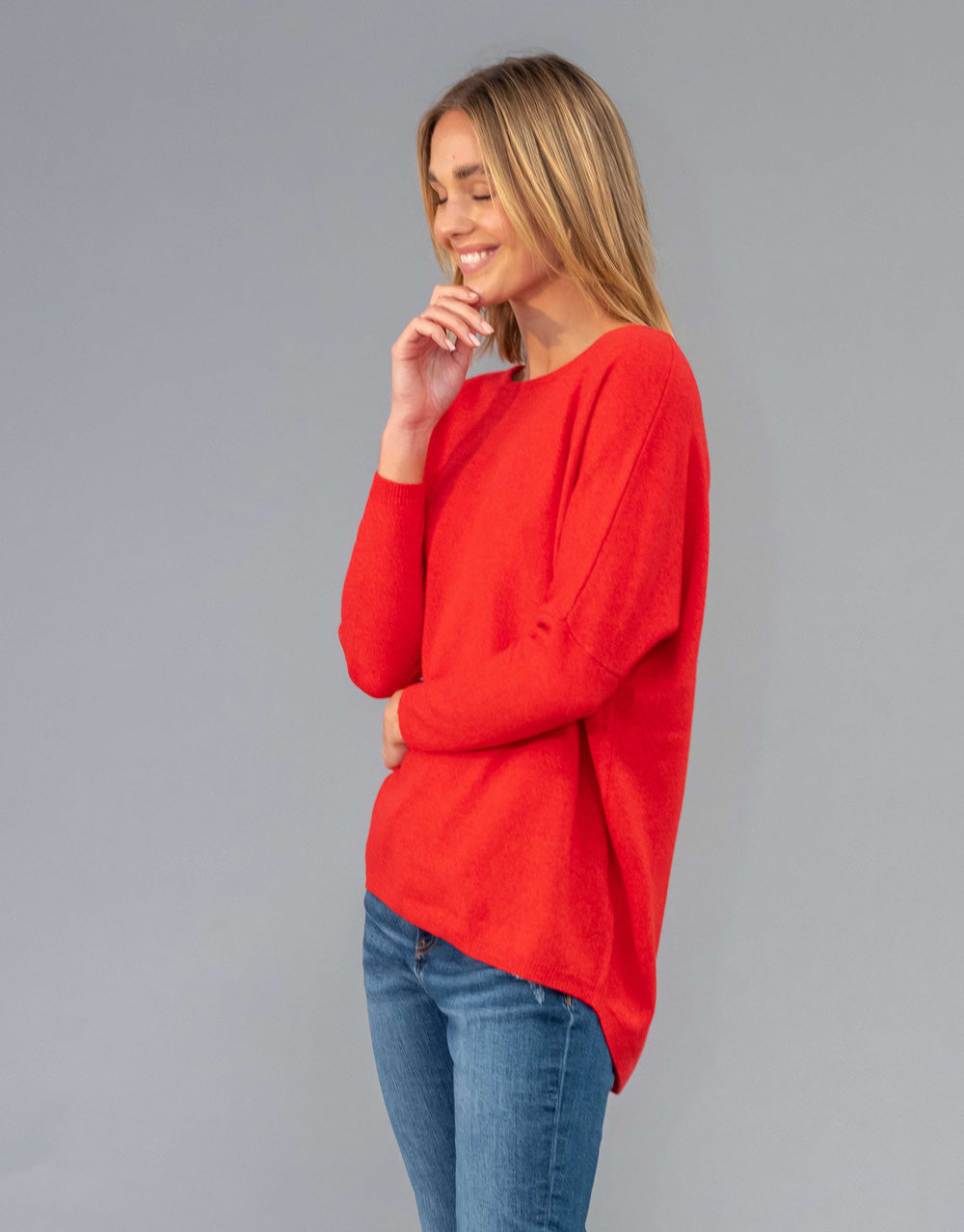 A flattering sweater for all shapes and sizes, our crew neck sweater drapes at the back with a curved hem complete with 3/4 sleeves. Wear it over your favourite pair of shorts and feel the softness of the cashmere.
